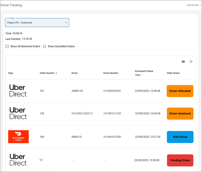 A driver tracking page can be displayed on a web browser in-store to show the real-time driver tracking statuses from Uber Direct and DoorDash Drive, allowing greater control over prep start times for orders and ensuring the best possible product is delivered to the consumer.